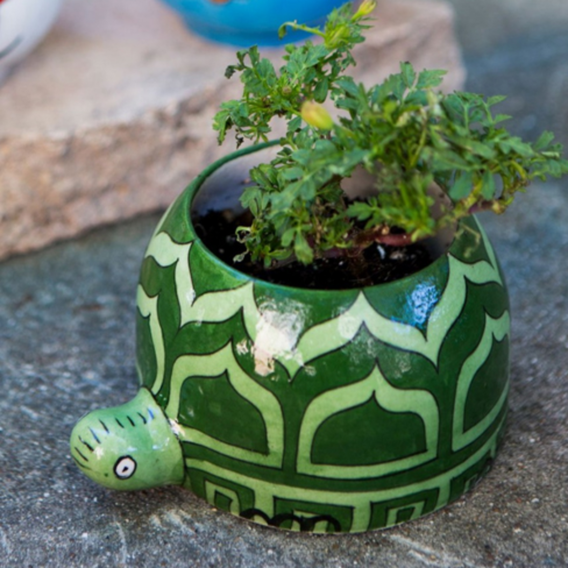 Turtle Planter Pot Green Colour With Drainage Handmade Blue Pottery